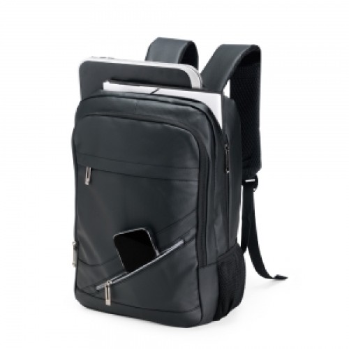 Descrição: Mochila em couro sintético impermeável com capacidade máxima de 26 litros. Possui compartimento principal com divisória para notebook de até 15,6 polegadas, além de dois compartimentos frontais em tamanhos diferentes, bolso lateral em malha com elástico e suporte USB. Conta ainda com alça de mão e duas alças para as costas com revestimento em tecido respirável.