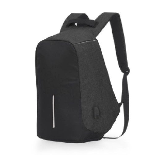 Descrição: Mochila anti-furto de poliéster. Pensando na segurança do usuário foi confeccionado o compartimento principal na área traseira, impossibilitando a abertura do produto mesmo com a mochila na costa do usuário. Possui dispositivo com entrada USB na parte externa com cabo USB acoplado internamente; permitindo a conexão de um carregador portátil na área interna e a conexão de um eletrônico na área externa, viabilizando a carga e utilização do eletrônico enquanto caminha. Área interna do compartimento principal: bolso para notebook de 15,6 polegadas, bolso para tablet, quatro bolsos para acessórios, possui nas laterais internas sistema de velcro, maximizando a segurança da mochila. Parte frontal com faixa refletiva, alças para as costas ajustáveis revestidas com espuma para um maior conforto sendo uma delas com bolso de zíper, alça para mãos e alça horizontal para encaixe em malas de viagem.